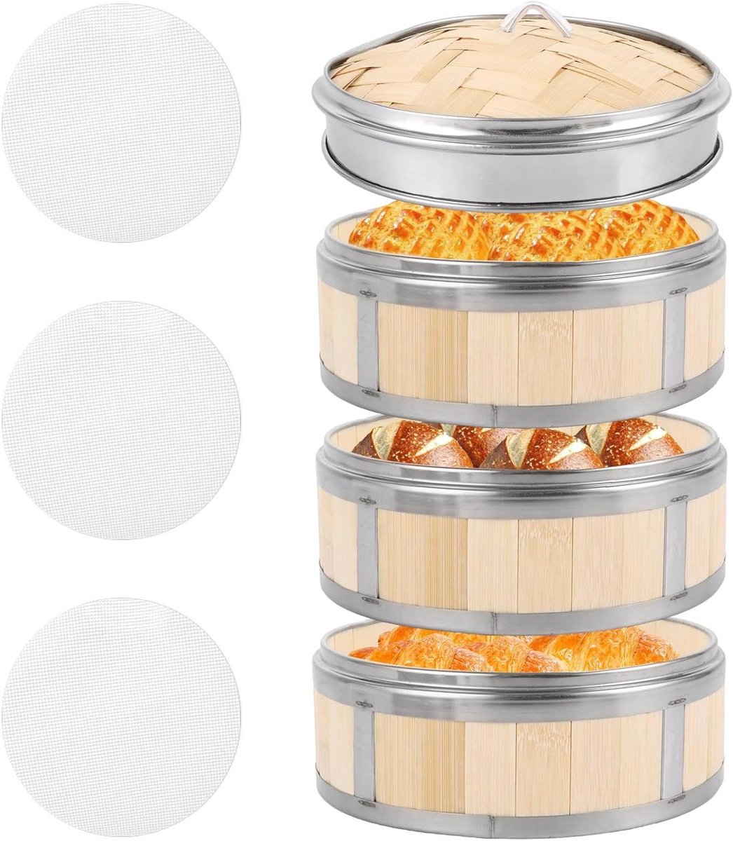 Cosensi – Bamboe Stoompan 20 cm met Deksel en Siliconen Onderleggers – Stapelbare Bamboestomer voor Groenten, Dumplings en Rijst