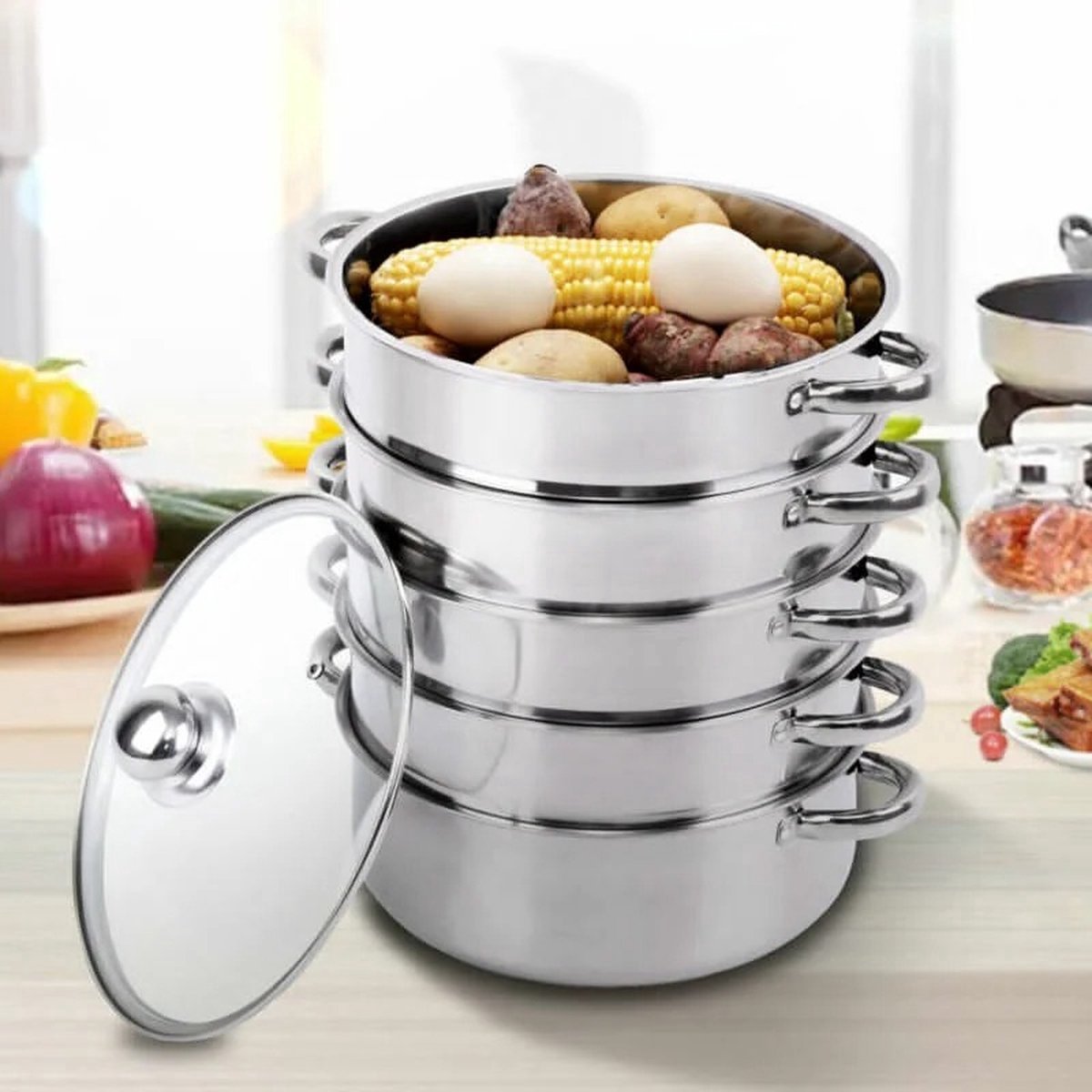 Vijf lagen voor optimaal stoomgebruik: De pan wordt geleverd met vier stapelbare stoominzetstukken, elk voorzien van een geperforeerde bodem om stoom gelijkmatig te verdelen. Dit maakt het mogelijk om meerdere gerechten tegelijkertijd te bereiden, waardoor u tijd bespaart.