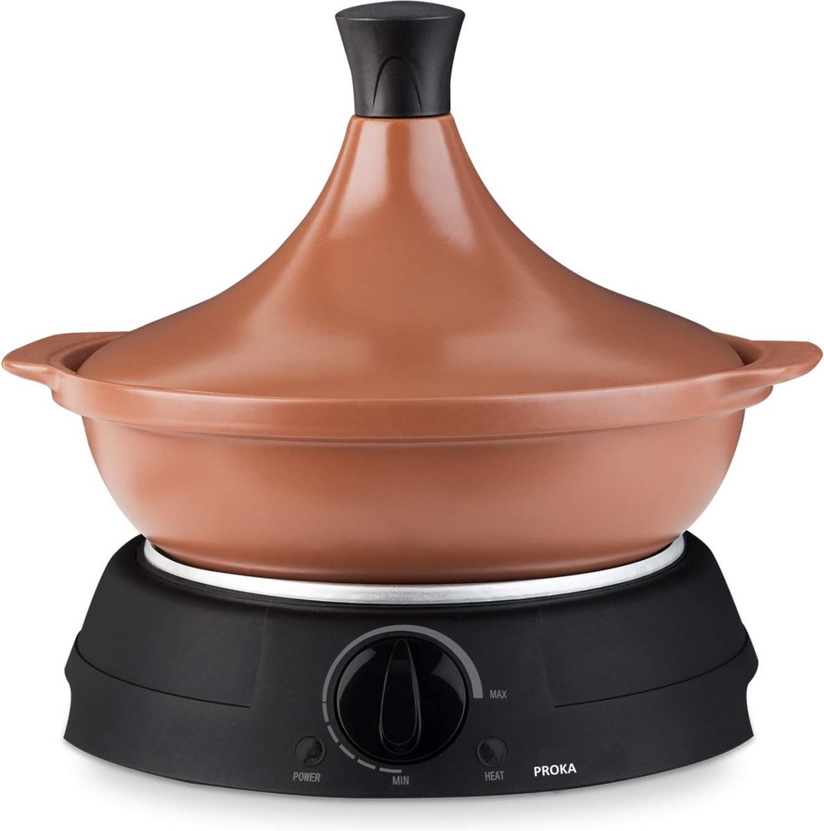 Deze PROKA elektrische tajine is ideaal voor het bereiden van tajine-gerechten en heeft een keramische pot met een inhoud van 2 liter. Met de temperatuurregelaar kunt u de perfecte temperatuur instellen om uw gerecht te bereiden. Het handvat aan de bovenzijde van het deksel heeft een warmte-isolerende greep. De speciale vorm van de tajine zorgt ervoor dat alle geuren en sappen bewaard blijven en de gerechten heerlijk van smaak en mals worden. Een ware smaaksensatie!
