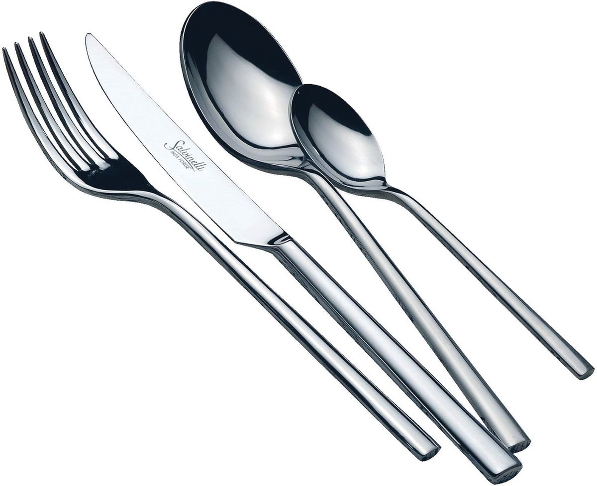 Deze hoogwaardige 24-delige bestekset is vervaardigd uit 18/10 roestvrij staal met een stevige dikte van 50 mm. Met een glanzende afwerking en een modern elegant design voegt deze set verfijning toe aan elke tafel. De set is compleet voor 6 personen en bestaat uit: 6 eetlepels (20 cm) 6 vorken (20 cm) 6 gesmede en gekartelde tafelmessen (235 cm) en 6 koffielepels (145 cm). Perfect voor dagelijks gebruik of speciale gelegenheden. Gemaakt in Italië.