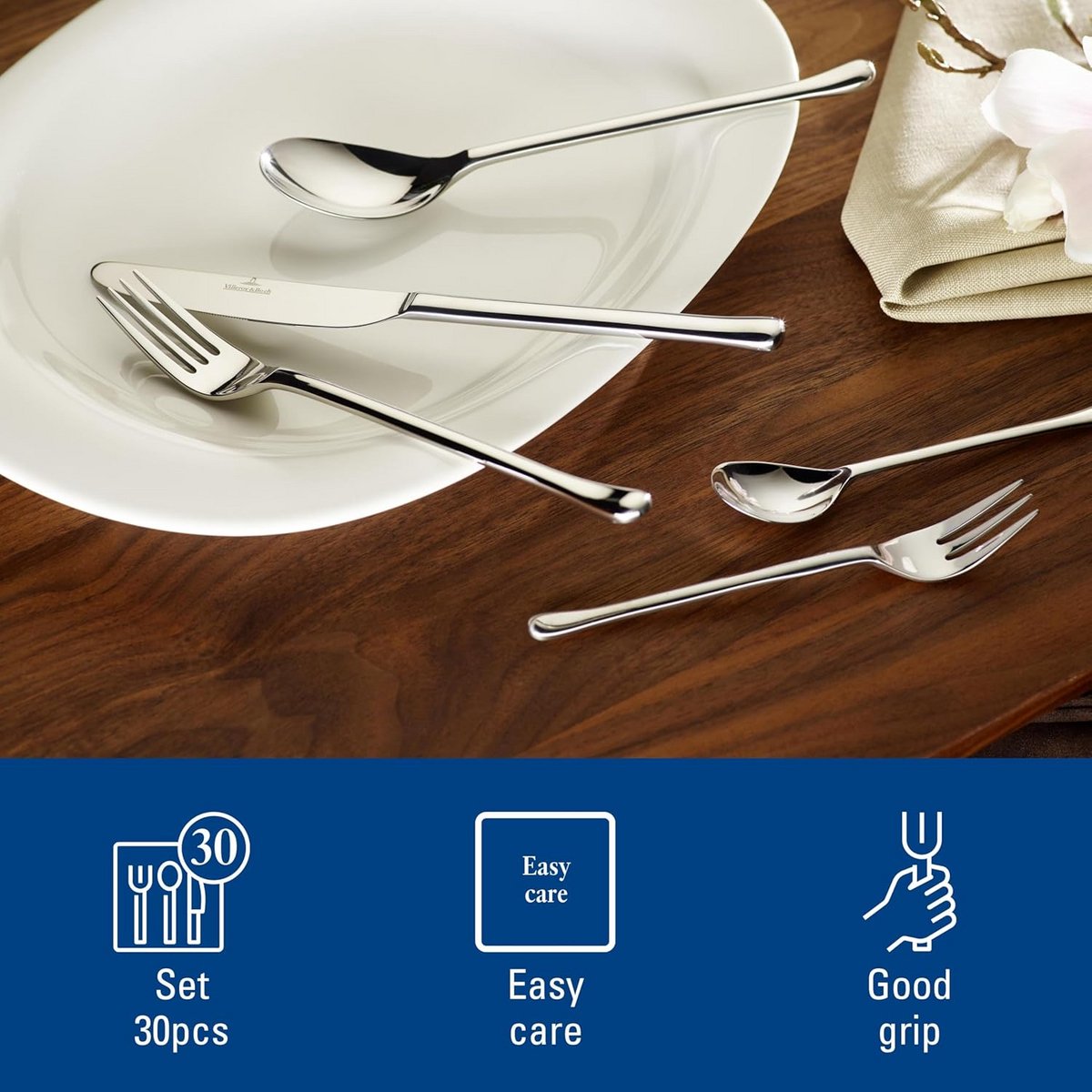 Complete 30-delige bestekset in een handige cassette. Deze hoogwaardige set van roestvrijstaal is geschikt voor dagelijks gebruik en maakt indruk tijdens elk diner. Het bestek is volledig vaatwasmachinebestendig voor eenvoudig onderhoud.