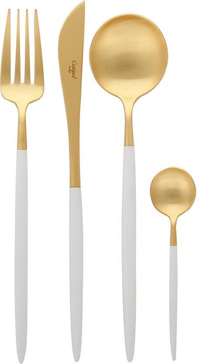 Bestekset Basic – Goa – Mat Goud-Wit van Cutipol is een van de mooiste besteksets die er is op dit moment. Het bestek is gemaakt van roestvrij staal met een 24K mat gouden finish. Yes, really – echt goud!!! Shine shine!