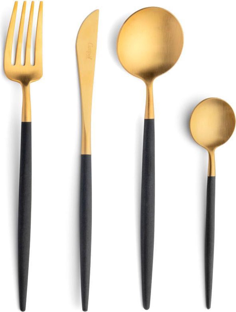 Bestekset Basic – Goa – Mat Goud-Zwart van Cutipol is een van de mooiste besteksets die er is op dit moment. Het bestek is gemaakt van roestvrij staal 18/10 met een 24K gouden finish en zwart heft. Dit is een regelrechte hit op je eettafel! Vele top restaurants dekken hiermee hun tafels en nu is het aan jou om hier elke dag van te kunnen genieten!