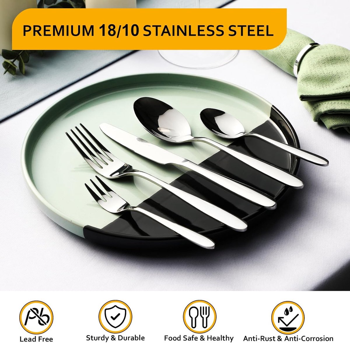 Set van 60 stuks Dinnware set voor 12- de set bevat 12 steakmessen, 12 eetvorken, 12 taartvorkjes, 12 eetlepels en 12 theelepels. Perfecte en onbuigzame kwaliteit en afgeronde randen. Biedt een mooie diner-ervaring, meer plezier bij het diner. Dit belooft de beste metgezel van je bord. Ideaal als cadeau voor je vrienden.