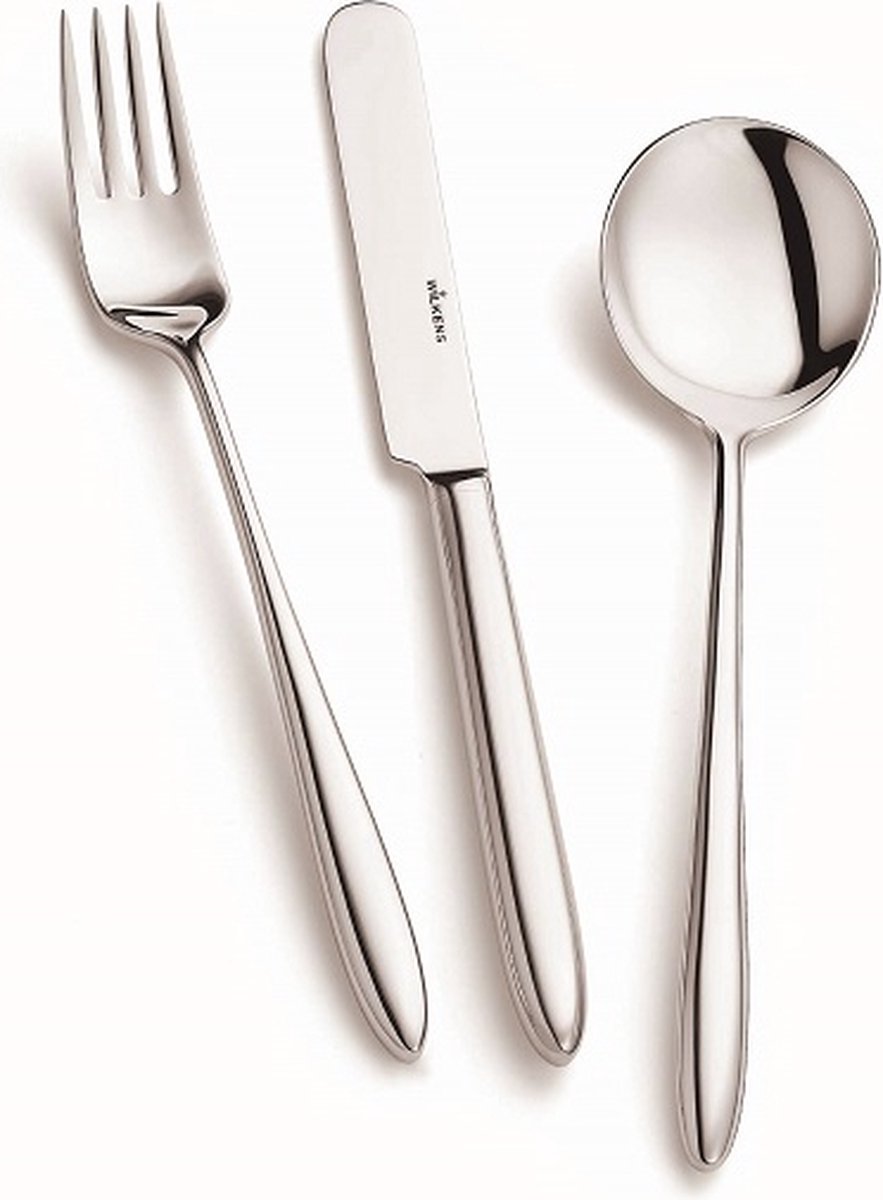 Ontdek de Tijdloze Elegantie van Wilkens Aura BestekOp zoek naar de perfecte balans tussen stijl, kwaliteit en functionaliteit? Laat ons je voorstellen aan Wilkens Aura bestek – een meesterwerk van tijdloze elegantie dat je tafelschikking naar een hoger niveau tilt.Wilkens Aura bestek is een symbool van vakmanschap en verfijning. Vervaardigd met zorgvuldige aandacht voor detail en met behulp van hoogwaardig roestvrij staal, is dit bestek niet alleen duurzaam maar ook prachtig ontworpen om indruk te maken op elke gelegenheid.Een van de meest opvallende kenmerken van Wilkens Aura is het uitgebalanceerde ontwerp dat prettig aanvoelt in de hand. Of je nu een formele dinerbijeenkomst hebt of een informele familiebrunch, het ergonomische ontwerp zorgt ervoor dat elk gerecht moeiteloos wordt opgepakt en elke maaltijd een genot wordt. Naast besteksets zijn alle onderdelen van dit bestek ook los leverbaar.Breng je tafelschikking naar nieuwe hoogten met het prachtige Wilkens Aura bestek. Kies voor tijdloze elegantie en duurzaamheid die de tand des tijds zal doorstaan.Bestel vandaag nog je Wilkens Aura bestek en laat je tafel schitteren met een vleugje tijdloze klasse!Hulp nodig of vragen over dit bestek? Ons team staat voor je klaar om je vragen te beantwoorden. Neem contact met ons op of kom langs in de winkel in Arnhem.Deze set bestaat uit 62-delen en is geschikt voor 6 personen:6 tafellepels,6 tafelvorken,6 tafelmessen,6 dessertlepels,6 dessertvorken,6 dessertmessen,1 aardappellepel,2 groentelepels,1 sauslepel,2 vleesvorkjes,6 taartvorkjes,6 theelepels,6 koffielepels,1 taartschep en1 suikerlepel.De set wordt geleverd in een Wilkens Cassettedoos.