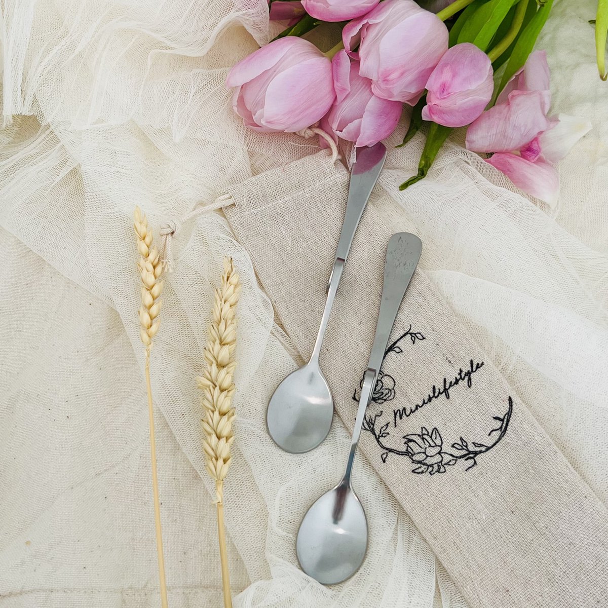 Home Servies Bestek Lepels Minislifestyle Jam- & Honinglepels RVS – Set van 2 – 15 cm – Geknikte Lepel voor Jam, Honing, Suiker & Sauzen – Bokaal lepel – Vaatwasserbestendig – Inclusief Luxe Linnen Zakje
