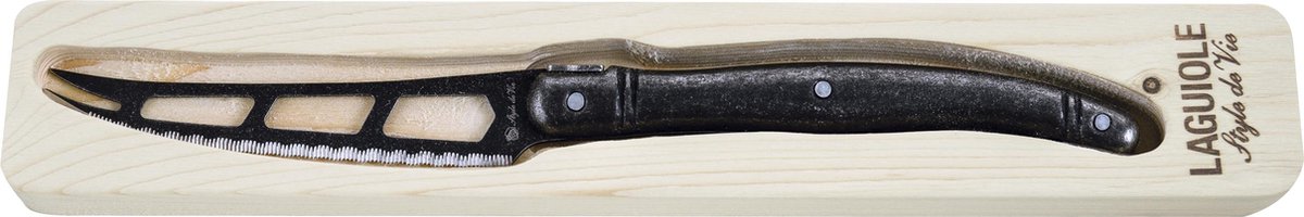 Het Laguiole Style de Vie kaasmes uit de Premium Line is voorzien van 3 grote gaten in het lemmet. Hierdoor is het kaasmes uitermate geschikt voor de zachte kazen. Het lemmet is gekarteld en voorzien van twee punten om de kaas gemakkelijk te snijden en te serveren. Het lemmet van het kaasmes is 10cm lang met een handvat van 11,5cm. Het kaasmes wordt geleverd in een houten tray. Door de zwarte stonewash kleur krijgt het kaasmes een stoer en robuust uiterlijk. Let op! Ondanks dat het kaasmes volledig van RVS is adviseren wij niet om het kaasmes schoon te maken met behulp van een vaatwasmachine.