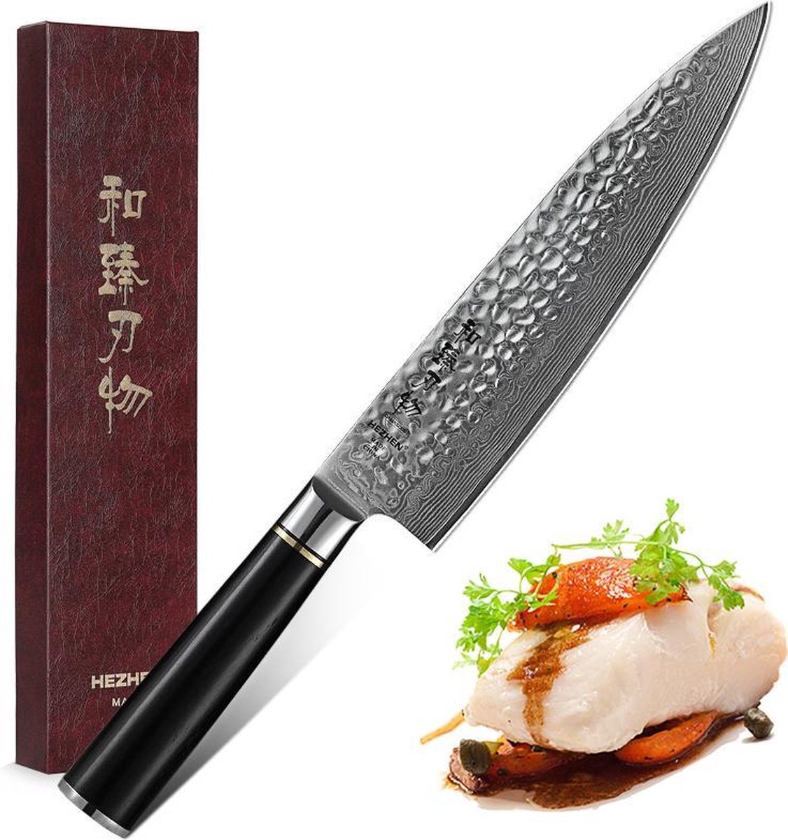 Een vlijmscherp Koksmes gesmeed uit Damascus staal van de HEZHEN B1Z series. Het mes bevat een lemmet van 20,2 cm met een hardheid van 60±2HRC. Het handvat is gemaakt van ebbenhout (ebony wood): een bijzonder harde, zware en duurzame houtsoort. Het Koksmes heeft een goede balans, ligt comfortabel in de hand en heeft een fantastische natuurlijke glans. Kortom, een op maat gemaakt Koksmes uit een luxe serie messen van Japans vakmanschap