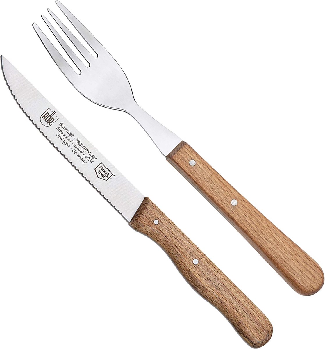 RÖR Solingen Steakmes – Vespermes – Gekarteld – Set met Vork – RVS – Beukenhout – 2 delig