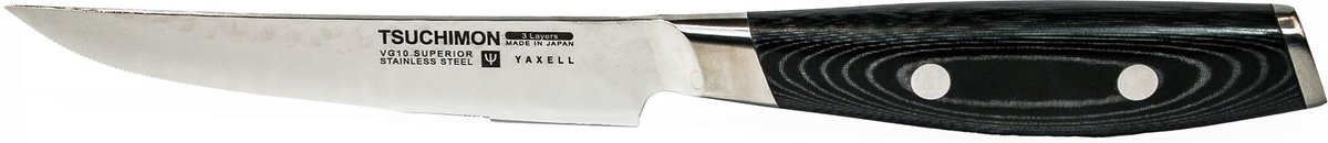 Ervaar de kracht van het Yaxell Tsuchimon steakmes Het Yaxell Tsuchimon steakmes is speciaal ontworpen voor liefhebbers van kwaliteitsmessen met een rustieke uitstraling. Het scherpe lemmet, gemaakt van VG10-staal, snijdt moeiteloos door de dikste steaks als een warm mes door boter. Het gehamerde profiel en het golvende patroon zijn geïnspireerd door de Japanse katana, wat het mes zowel functioneel als esthetisch aantrekkelijk maakt.