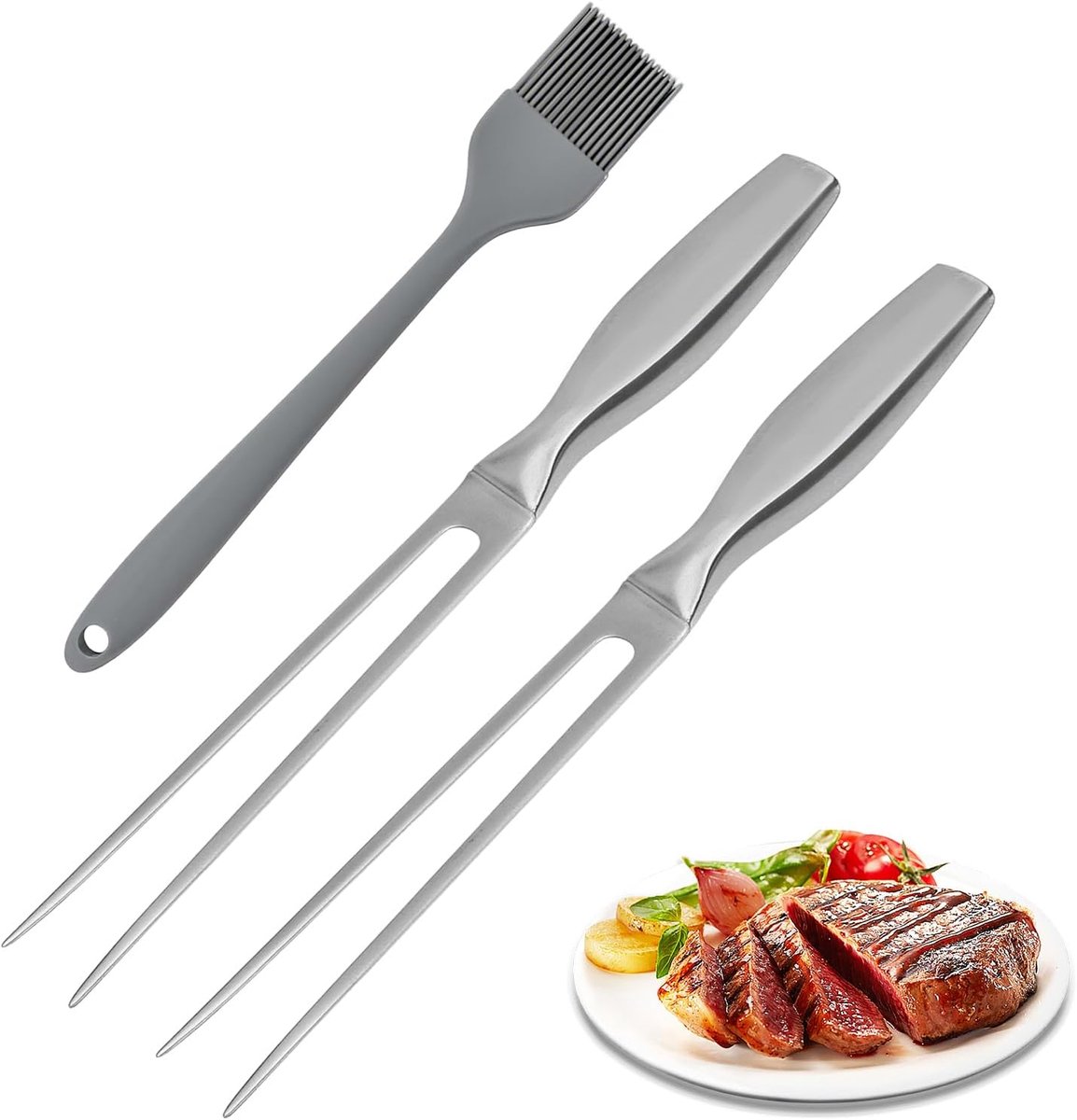 Meat Fork Set – Perfect voor de BBQ en Keuken Ontdek de voordelen van onze Meat Fork Set, die bestaat uit twee hoogwaardige 27 cm roestvrijstalen vleesvorken en een praktische siliconen olieborstel. Dit set is een must-have voor elke barbecue-liefhebber en maakt het bereiden van vlees nog gemakkelijker en aangenamer!