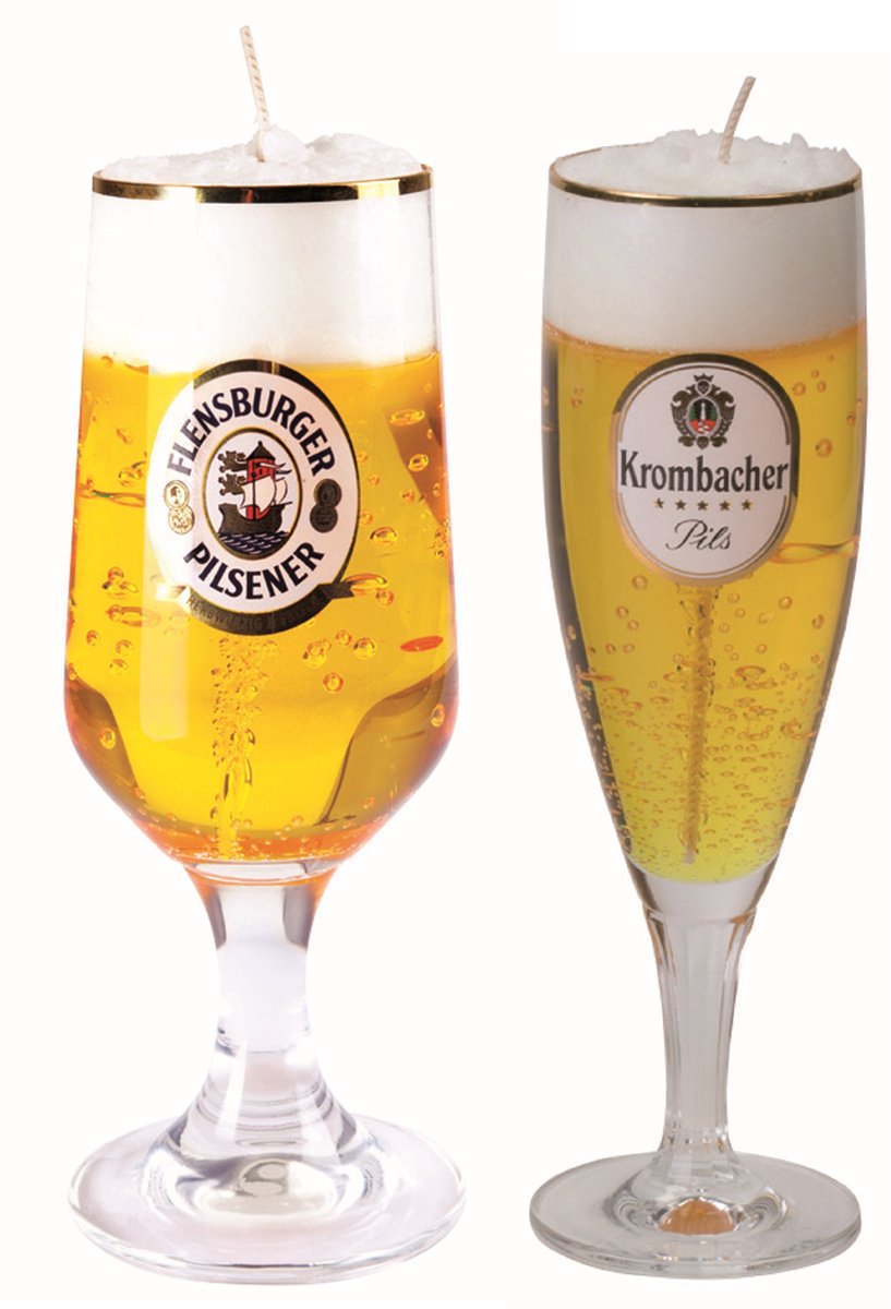 de Flensburger bierglas kaars (ca. 20 cm hoog) en de Krombacher bierkaars (ca. 20 cm hoog) zien er bedrieglijk echt uit – alsof er net een koud biertje is ingeschonken! Perfect als grappig en sfeervol cadeau voor elke man die van bier houdt.