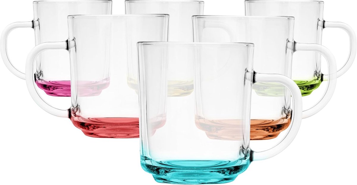 230ml, Set van 6 stuks, Glazen mokken, glazen met handvat, gekleurde bodem, theeglas, mok, glazen mok met oor, klassieke en universele stijl