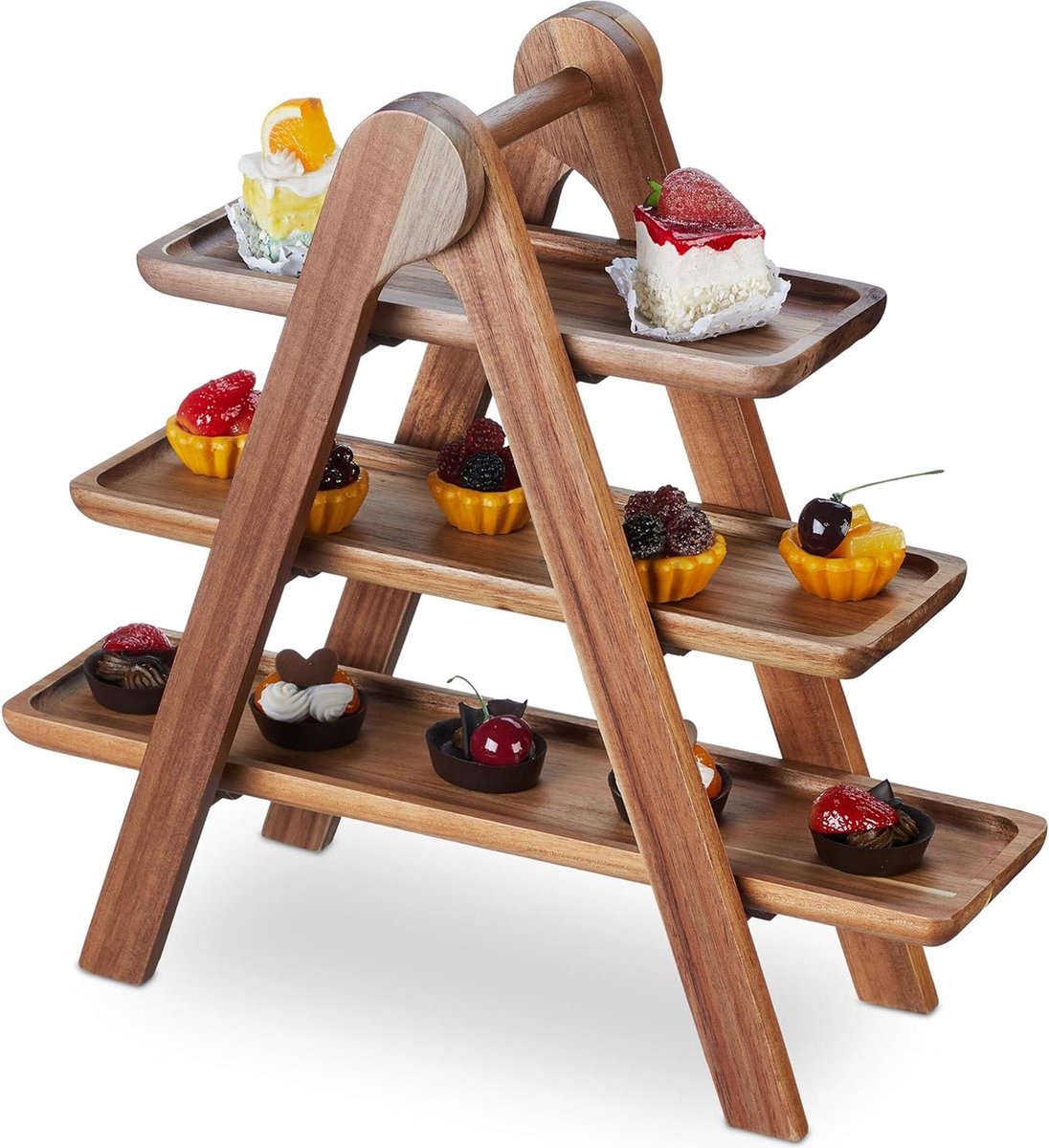 Etagère van acaciahout met 3 lagen – Inklapbaar frame – Houten serveerschaal – Rustiek design – Afmetingen: 38 x 41 x 15 cm – Bruin