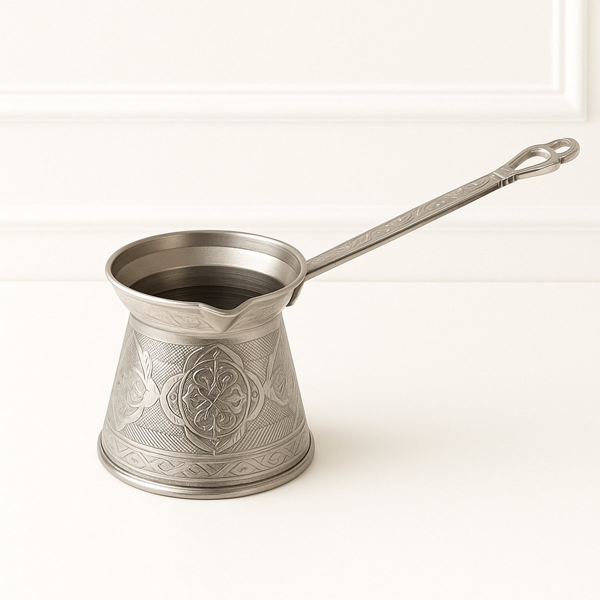 Mevaz Luxe Handgemaakte Turkse Koffiepot (Cezve) – 450 ml – Zilverkleurig Koper met Gravure – Traditionele Ottoman Stijl Ontdek de kunst van authentieke koffie met de Mevaz Luxe Handgemaakte Turkse Koffiepot (Cezve). Deze verfijnde koffiepot is gemaakt van hoogwaardig koper met een elegante zilverkleurige afwerking, rijkelijk versierd met traditionele gravures geïnspireerd op de tijdloze Ottoman-stijl. Met een inhoud van 450 ml is dit de ideale keuze voor het bereiden van heerlijke Turkse koffie, espresso of mokka – precies zoals het hoort.