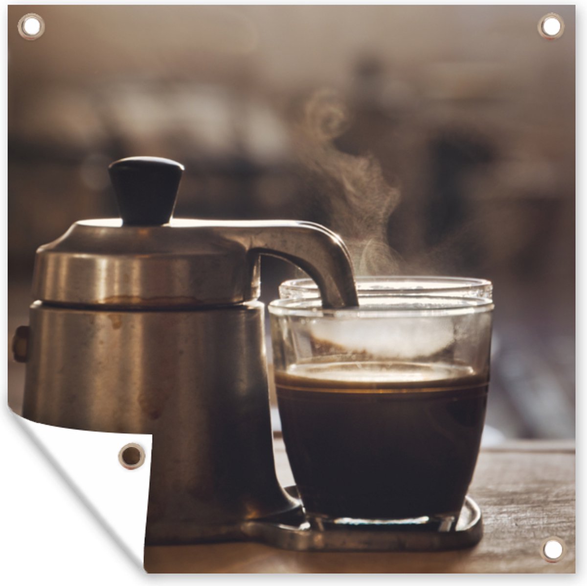 Tuinschilderij – Een kleine koffiepot met twee koppen koffie – Tuinposters buiten De GreatGardenPosters tuinposter is de ideale manier om meer sfeer aan je tuin te geven. Door middel van de ingezoomde ringen is het tuindoek zeer gemakkelijk op te hangen en blijft hij ook goed hangen in weer en wind. Als je op zoek bent naar een leuke tuindecoratie ben je bij GreatGardenPosters aan het juiste adres.