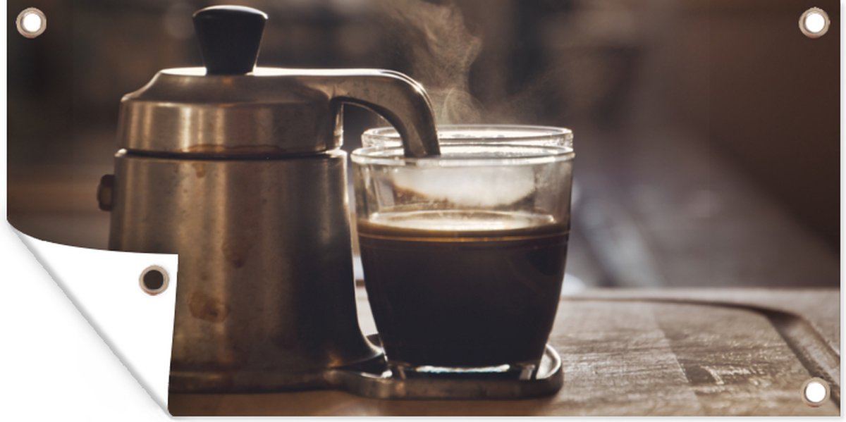 Tuinposter Een kleine koffiepot met twee koppen koffie - 60x30 cm - Tuindoek - Buitenposter - Kookstore.nl