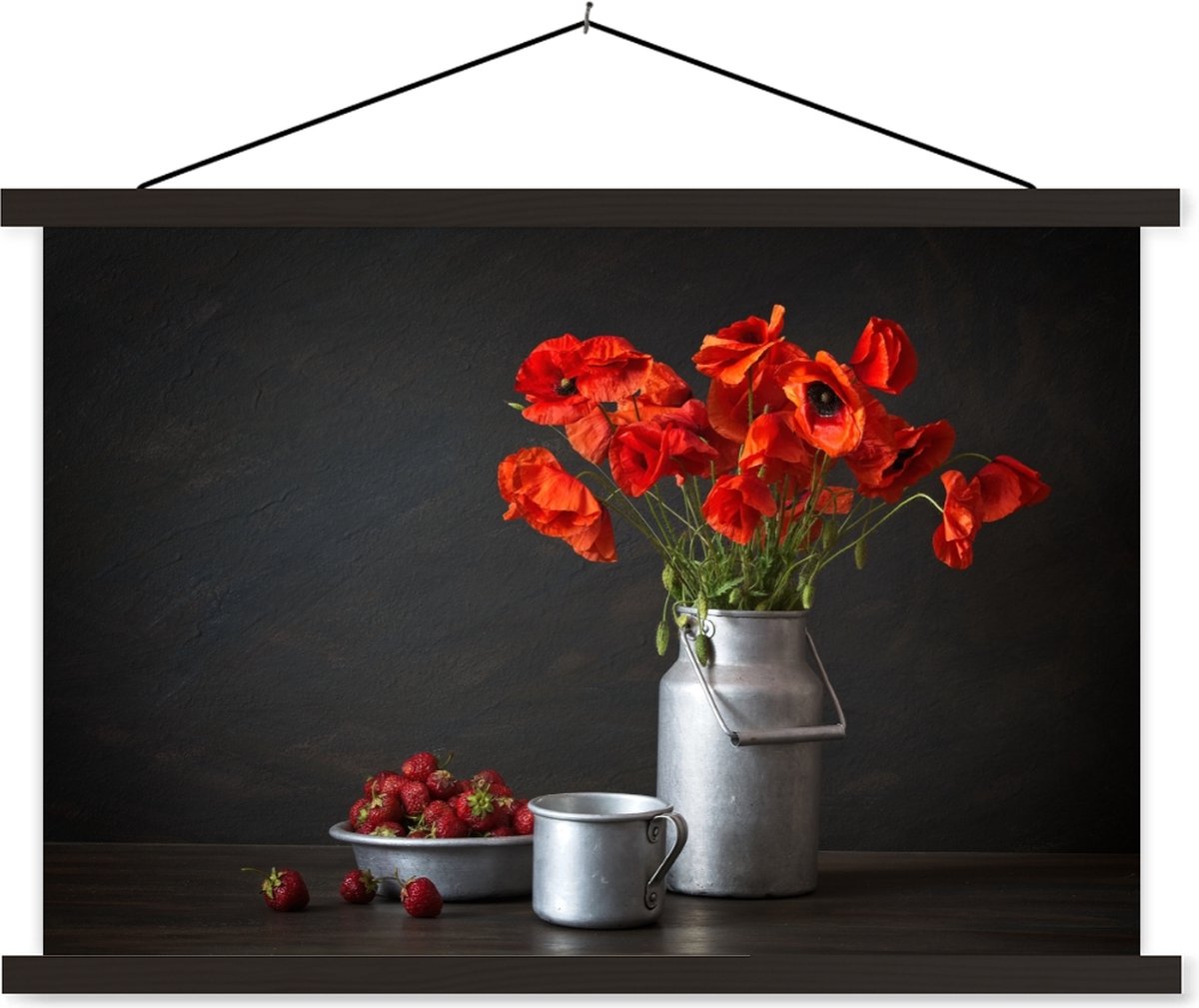 Posterhanger incl. Poster 90x60 cm - Schoolplaat - Stilleven - Klaprozen - Melkkan - Textielposter - Zwarte latten - Kookstore.nl