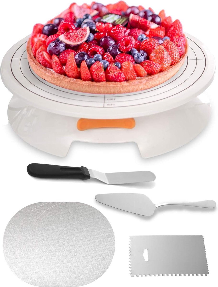 Met een diameter van 30,8 cm en een hoogte van 7,5 cm is deze taartstandaard perfect geschikt voor de meeste taarten. De bijgeleverde taartlifter, spreidpalet, schraper en taartpads maken het decoreren nog gemakkelijker.