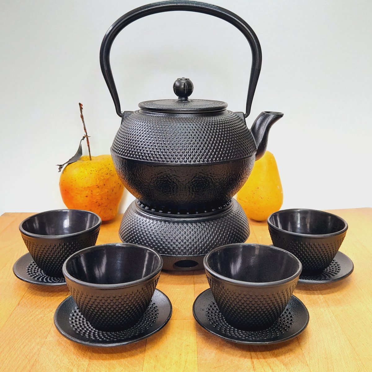 Mooie gietijzeren theepot set zwart 1.2 L met warmhouder 4 kopjes van 100 ML en 4 leuke schotels