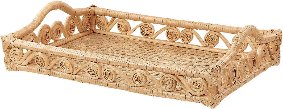 Rechthoekige decoratieve serveerblad met handvaten. Geef je interieur een oppepper met dit decoratieve dienblad geïnspireerd op de boho-stijl. Het is handgemaakt van natuurlijk rotan in een lichte kleur en is perfect om je sieraden in op te bergen, maar kan ook worden gebruikt als handig dienblad of eenvoudige, opvallende decoratie. Het is voorzien van handgrepen zodat je het makkelijk kunt verplaatsen en heeft een decoratief spiraalpatroon dat de aandacht zal trekken van al je gasten.
