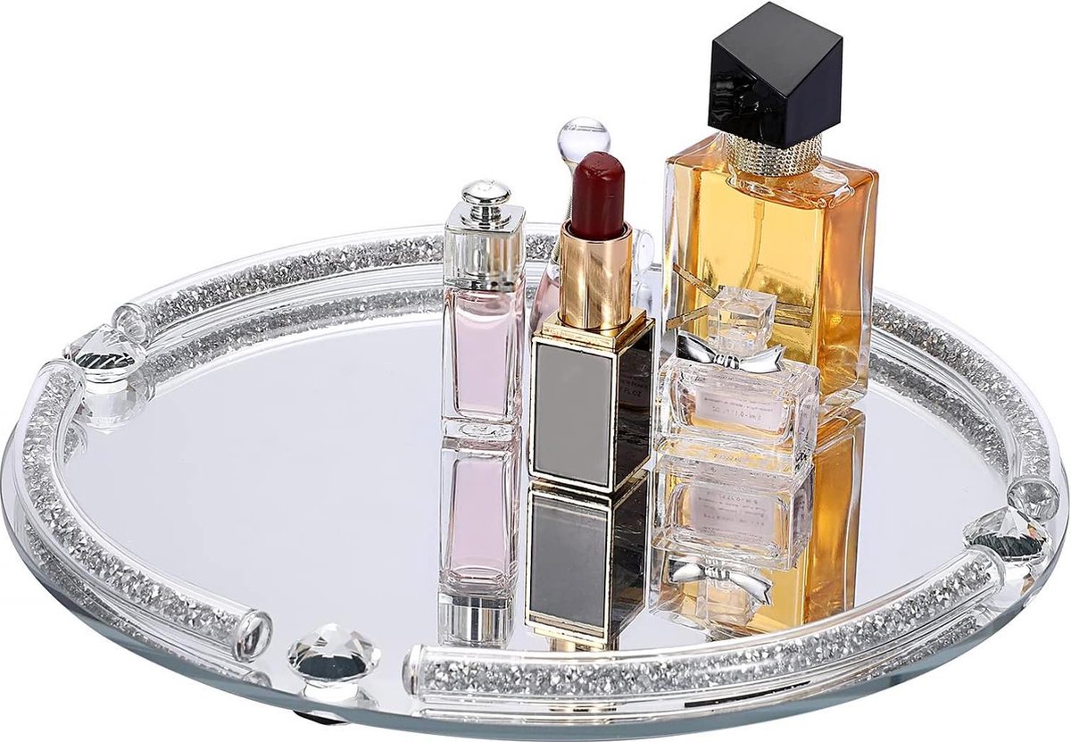 Glas spiegelend dienblad 25 cm met geraspte diamanten frame – ronde decoratieve display tablet kristal – dienblad voor cosmetische parfum sieraden.