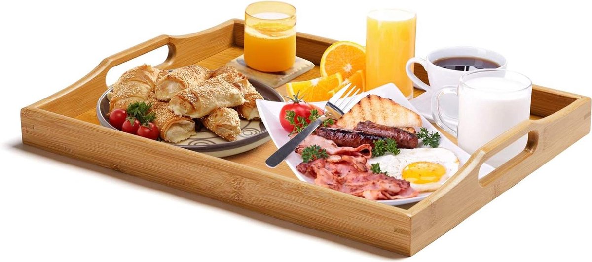 Ons rechthoekige bamboe dienblad is van hoge kwaliteit met een onovertroffen stijl. Je kunt een prachtig rustiek houten dienblad verwachten dat zowel duurzaam als licht is. Het is groot genoeg om al je benodigdheden binnen handbereik te houden. Gemaakt van natuurlijk bamboe, wat niet alleen duurzaam en robuust is, maar ook milieuvriendelijk in vergelijking met plastic dienbladen.