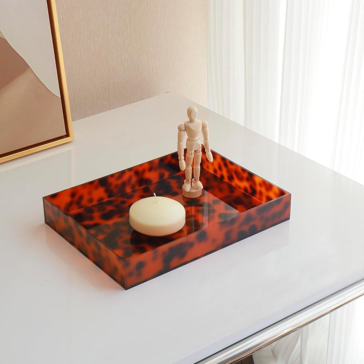 Dit koffietafel deco dienblad is voorzien van een luipaardpatroon, dat klassiek is en nooit uit de mode raakt. Het past bij elke woonstijl en geeft een vleugje elegantie aan je interieur. De hand bewerkte afwerking met gepolijste randen en afgeronde hoeken zorgt ervoor dat het dienblad veilig en comfortabel te gebruiken is. Gemaakt van verdikt acryl, is het duurzaam en heeft het een langere levensduur dan andere dienbladen op de markt.
