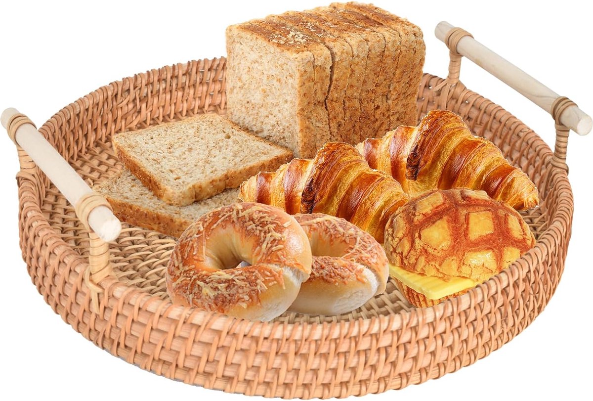 Rotan dienblad rond 24cm rotan geweven dienblad, dienblad met handgrepen, dienblad rond antislip, handgeweven rotan dienblad wikkeldienblad, geweven broodmand fruitmanden