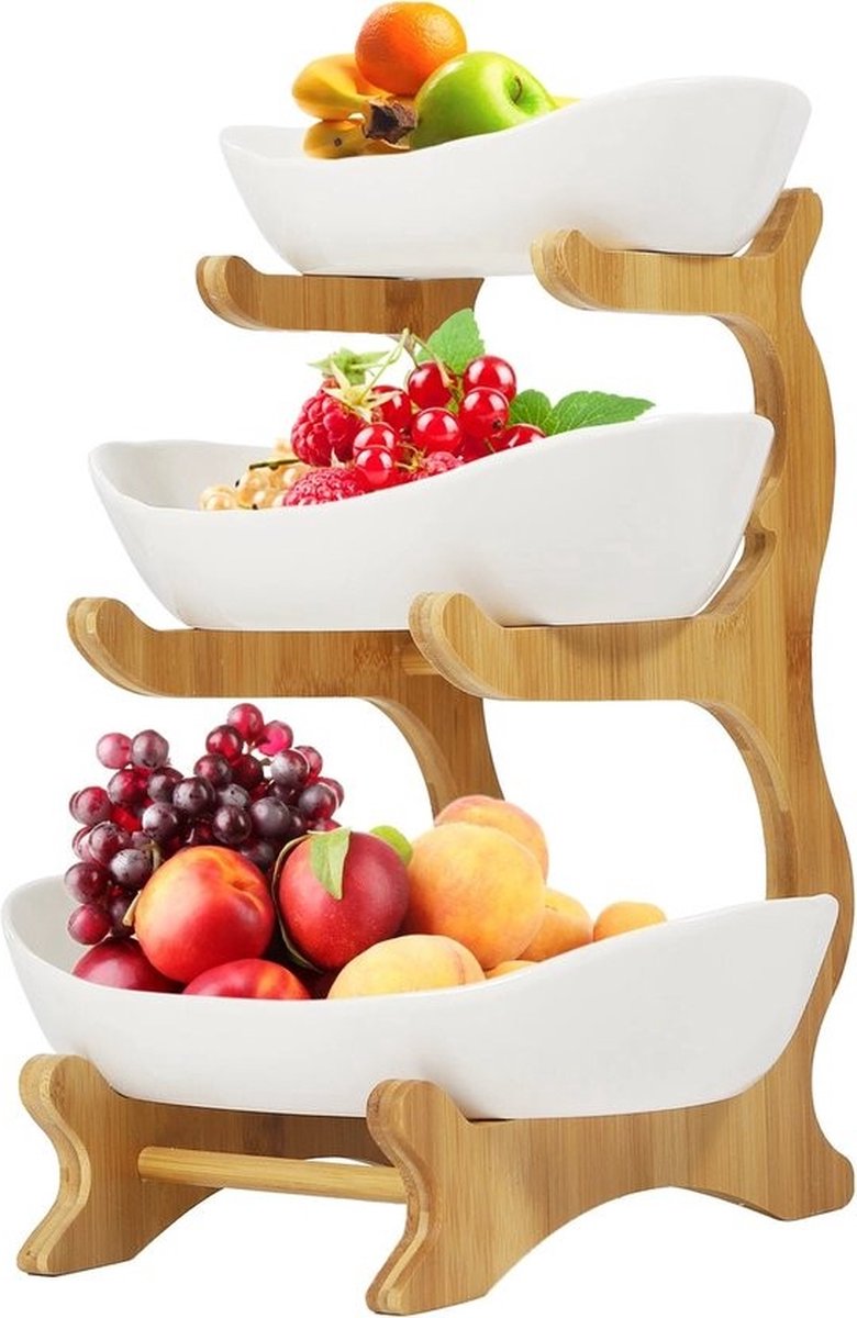 Fruitschaal - Fruitmand - Met 3 Lagen - Candy Cake Trays - High Tea - Houten Servies - Wit - Kookstore.nl