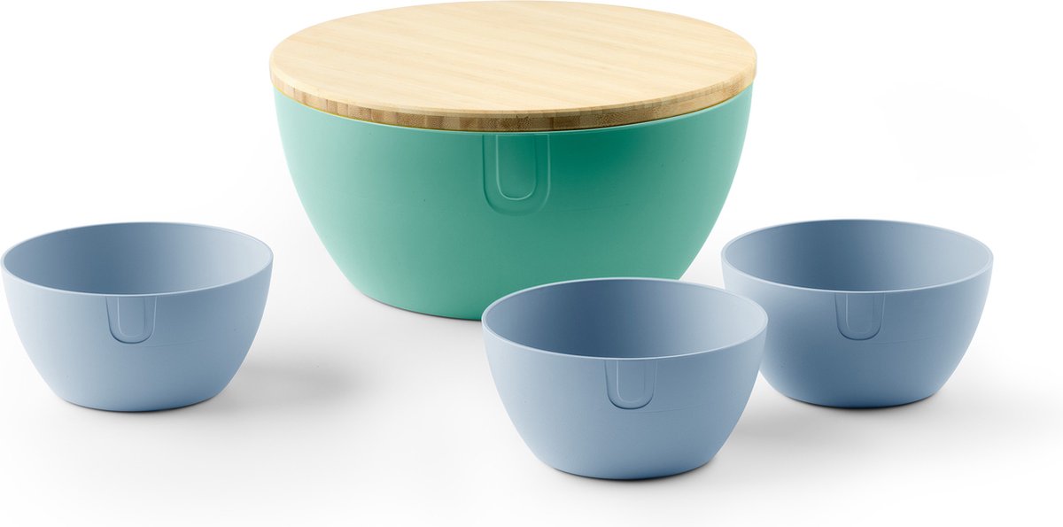 UBITE set – bio-based saladeschaal aquamarine groen (XL – Ø 27) inclusief deksel/snijplank + set van 3 bio-based bowls silicate blauw (S – Ø 13) – saladeschaal/saladekom/kom/schaal/bakje/duurzaam