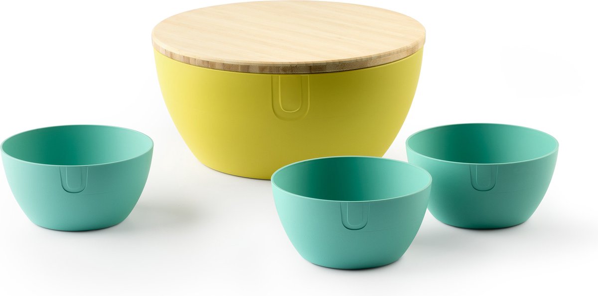 UBITE set – bio-based saladeschaal cyber geel (XL – Ø 27) inclusief deksel/snijplank + set van 3 bio-based bowls sky blauw (S – Ø 13) – saladeschaal/saladekom/kom/schaal/bakje/duurzaam