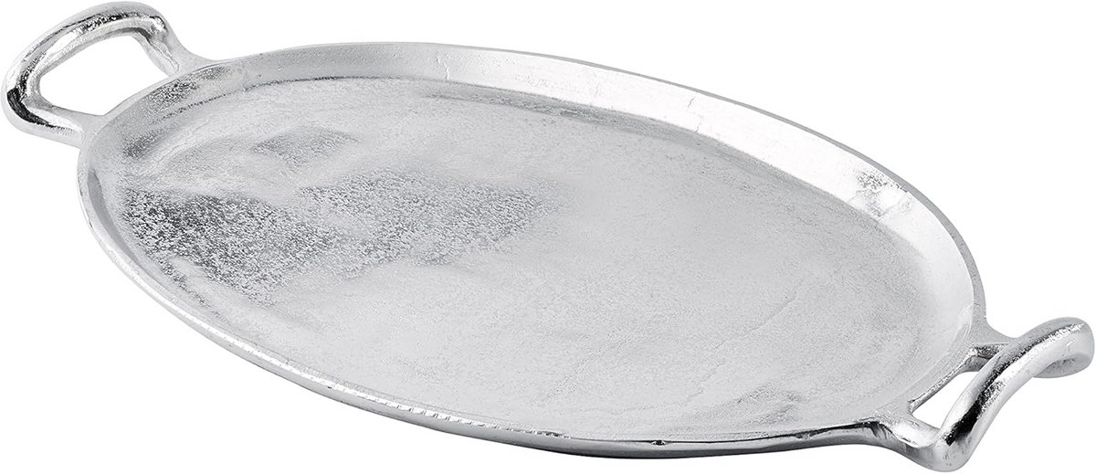 Dit luxe, ovale dienblad van zwaar aluminium is een prachtig en massief decoratief hoogtepunt voor elk interieur. Met een indrukwekkende afmeting van 56x35x7 cm is dit zilverkleurige dienblad perfect als XL serveerplank of als sfeervolle basis voor kaarsen en windlichten op uw eettafel, dressoir of vensterbank. Het dienblad is 100% handgemaakt en heeft een unieke, ruwe look die zorgt voor een zeer luxueuze uitstraling. Voorzien van twee stevige handgrepen aan de zijkant, kan het dienblad veilig en gemakkelijk worden vervoerd, zelfs wanneer het gedecoreerd is. Dit veelzijdige woonaccessoire integreert moeiteloos in elke woonstijl en is ook uitermate geschikt voor professioneel gebruik in restaurants, bars of hotels. Het onderhoud is eenvoudig; afnemen met een droge of licht vochtige doek volstaat. Voeg een vleugje exclusiviteit toe aan uw huis met dit hoogwaardig afgewerkte, zilveren aluminium dienblad.