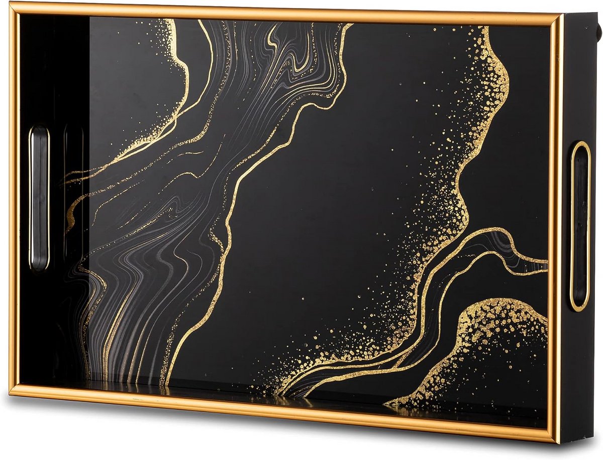 Maak indruk met deze prachtige, decoratieve serveerschaal in zwart en goud. Ideaal als blikvanger op uw salontafel, poef of als baraccessoire. De schaal combineert een moderne, lichte luxe en eenvoudige stijl. Het blad is vervaardigd van duurzaam glas met een uniek, goudkleurig patroon dat een artistiek tintje geeft aan uw interieur. Dankzij het gladde glas is de schaal zeer eenvoudig schoon te maken met een vochtige doek. De schaal is voorzien van twee stevige, ingebouwde handvatten voor gemakkelijk dragen en heeft een opstaande rand van 4,5 cm om rondslingeren van spullen te voorkomen. De onderkant is voorzien van vilt om krassen op meubels te voorkomen. Met een ruim oppervlak van 38 x 25 cm biedt deze schaal voldoende plek voor uw afstandsbedieningen, kaarsen, cosmetica of drankjes. Een elegante en veelzijdige toevoeging aan elk huis, woonkamer of eetgedeelte.