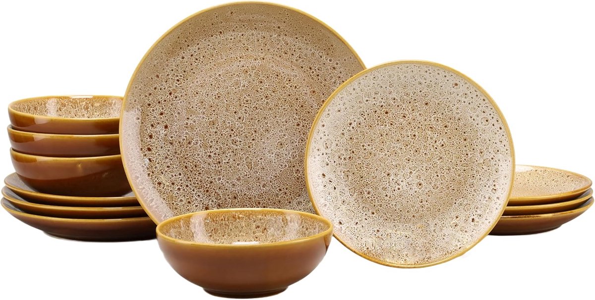 Verrijk uw eettafel met deze prachtige 12-delige serviesset, een ware aanwinst voor elke keuken en eetkamer. Deze set, vervaardigd uit hoogwaardig aardewerk, belooft duurzaamheid en stijl voor dagelijks gebruik en speciale gelegenheden. Het unieke, reactieve glazuur zorgt ervoor dat elk stuk een individueel karakter heeft, waardoor uw tafelsetting altijd uniek en sfeervol is. Geniet van de warme, rijke tinten die uw maaltijden nog aantrekkelijker maken. Herkent u het probleem van een eentonige tafelsetting of servies dat snel zijn glans verliest? Zoekt u naar servies dat zowel praktisch als esthetisch is, en dat de sfeer van uw maaltijden verhoogt? Deze serviesset is speciaal ontworpen om aan deze behoeften te voldoen. Het is de perfecte oplossing om uw huiselijke diners om te toveren tot een culinaire ervaring, waarbij elk gerecht wordt gepresenteerd op servies dat net zo uniek is als uw gasten. Deze veelzijdige serviesset is ideaal voor diverse gelegenheden, van ontbijt tot diner, en van een intiem samenzijn met familie tot een feestelijke bijeenkomst met vrienden. De set bestaat uit vier platte borden van 27 cm, vier dessertborden van 20 cm, en vier multifunctionele kommen van 16 cm. Deze samenstelling biedt flexibiliteit voor elke maaltijd. Gebruik de grote borden voor uw hoofdgerechten, de kleinere borden voor salades of voorgerechten, en de kommen voor soep, desserts of bijgerechten. De set is perfect voor gebruik thuis, in de keuken, of tijdens een gezellig diner met dierbaren. Het aardewerk is robuust en ontworpen om lang mee te gaan, waardoor het een duurzame keuze is voor uw huishouden. Ervaar het plezier van eten van servies dat met zorg en oog voor detail is ontworpen. De voordelen van deze set zijn talrijk: het verhoogt het eetplezier door de unieke uitstraling, bespaart u tijd dankzij de vaatwasser- en magnetronbestendigheid, en biedt gemoedsrust door de solide constructie. Het unieke glazuur zorgt voor een constante bron van bewondering bij uw gasten. Deze set maakt van elke maaltijd een speciaal moment en draagt bij aan een warme en uitnodigende sfeer in uw huis. Het is de perfecte manier om uw huiselijke comfort te verhogen en uw gastvrijheid te tonen. Het unieke verkoopargument van deze serviesset is het speciale reactieve glazuur. Dit glazuur wordt op een speciale manier aangebracht, waardoor het tijdens het bakproces onregelmatig reageert. Het resultaat is een subtiel, natuurlijk ogend patroon dat elk stuk servies uniek maakt. Geen twee borden of kommen zijn exact hetzelfde, wat een artistieke en ambachtelijke uitstraling geeft aan uw tafel. Deze kenmerkende afwerking, gecombineerd met de warme cognac- en bruintinten, creëert een visueel aantrekkelijk geheel dat uw maaltijden naar een hoger niveau tilt. De set is niet alleen functioneel, maar ook een decoratief element dat uw interieur verrijkt. Wacht niet langer om uw eetervaring te transformeren. Voeg deze bijzondere 12-delige serviesset toe aan uw winkelwagen en begin vandaag nog met het creëren van onvergetelijke momenten rond de eettafel. Ontdek de perfecte combinatie van functionaliteit, duurzaamheid en uniek design.
