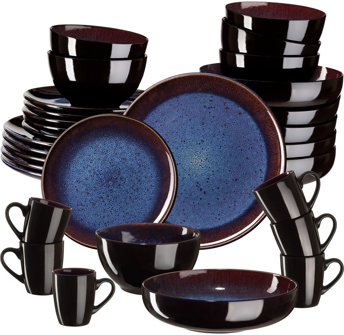 tectake® Serviesset Mare – 30-delig – Aardewerk met Glanzend Glazuur – 6 Persoons – Handgemaakt Servies – Moderne Bordenset met Grote en Kleine Borden, Kommen, Schaaltjes en Kopjes – Vaatwasser- en Magnetronbestendig – Blauw – Bruin