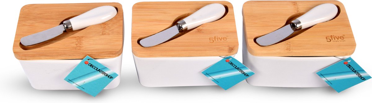 – Verpakkingsinhoud: 3x Botervloot Keramiek 3x luchtdichte deksel (bamboe) 3x botermes (RVS)