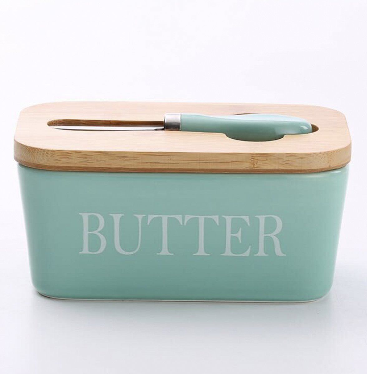 ZYLARO Botervloot – Botervloot met Botermes en Deksel – 600 ml Botervloot van Keramiek en Bamboe – tiff blauw