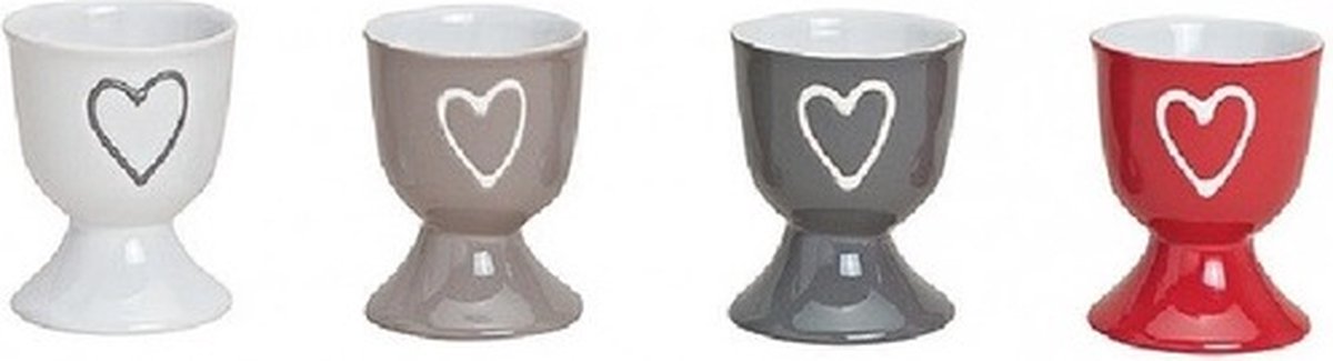 4x Eierdopjes gekleurd met hartje. Set van 4 eierdopjes met hartje in de kleuren wit, lichtgrijs, antraciet en rood. Formaat per stuk: 6 x 5 cm. Materiaal: keramiek. Niet geschikt voor in de vaatwasser. Leuke tafel accessoire voor bij het ontbijt, de lunch of een brunch.