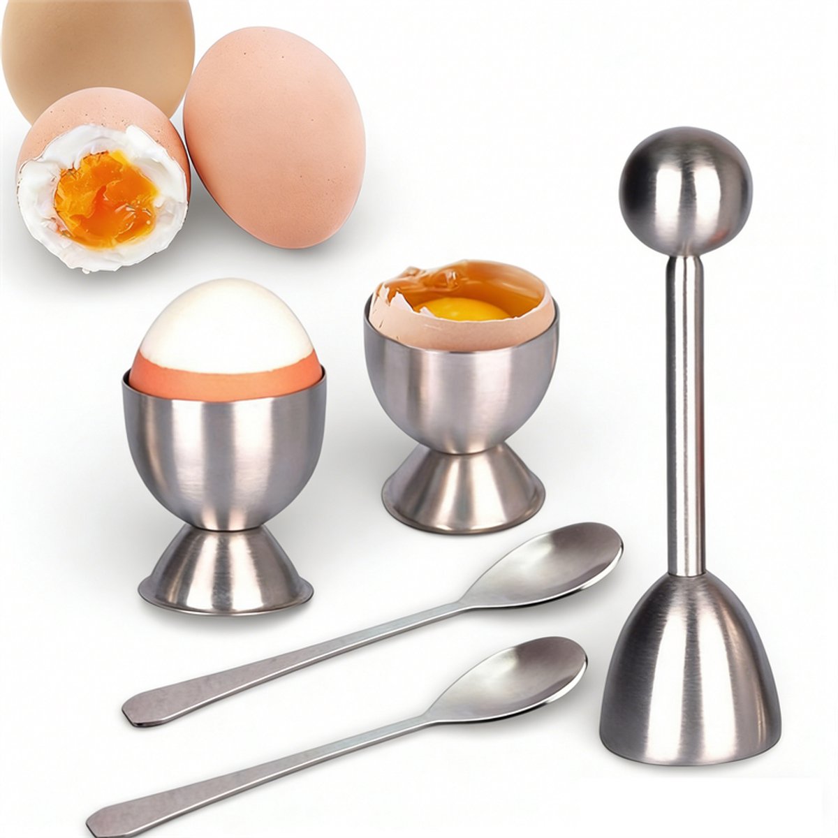 Complete 5-delige set: Deze set bevat 1 eierkraker (13,7 cm lang), 2 eierdopjes (4,5 cm hoog) en 2 eierlepels (11,8 cm lang). Hiermee kunt u voor het hele gezin gemakkelijk een gezond ontbijt bereiden. Alles wat u nodig heeft in één set.