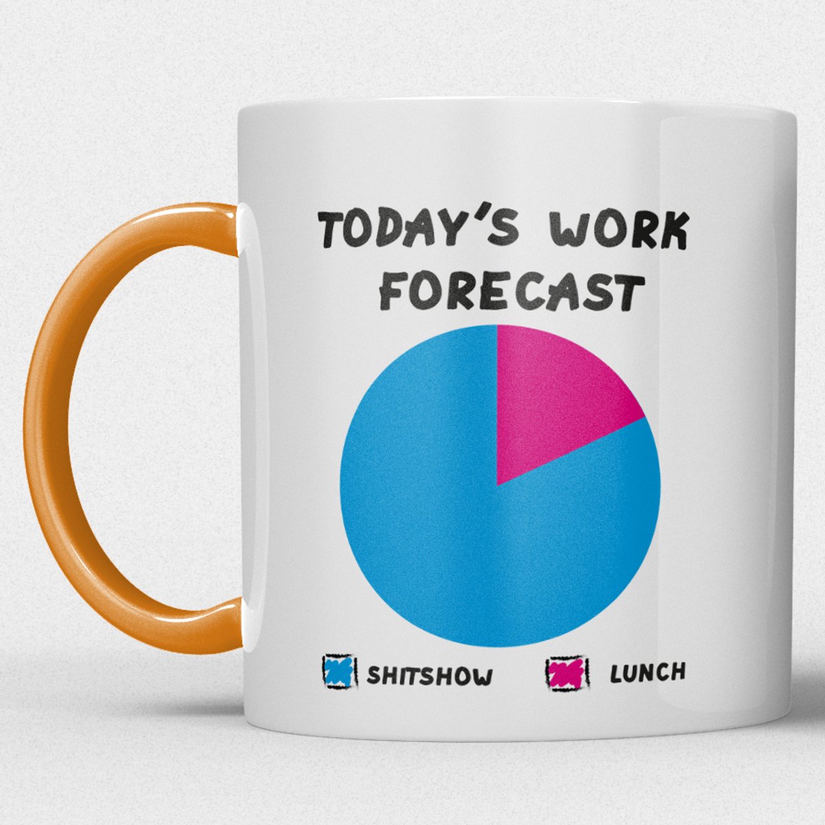 Bestel vandaag nog deze wit oranje Today’s Work Forecast koffiemok en breng een glimlach op ieders gezicht tijdens de koffie- of theepauze!