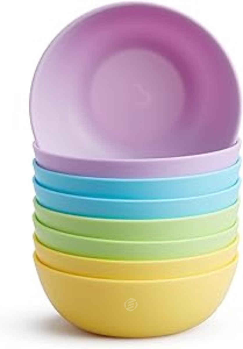 Belangrijkste Kenmerken: Set van 8 kommen: De set bevat 8 plastic kommen in 4 verschillende felle pastelkleuren, ideaal voor het serveren van verschillende maaltijden of snacks voor je kleintje.