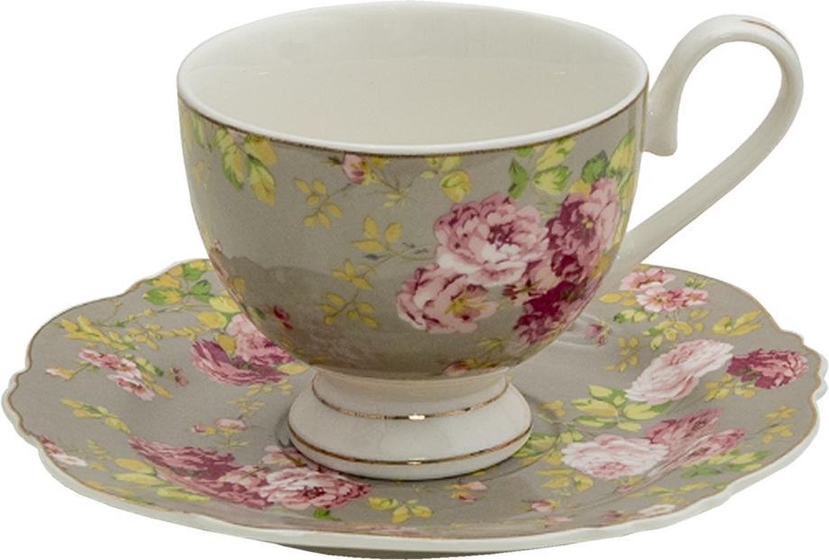 Clayre & Eef Kop en Schotel 200 ml Groen Wit Porselein Bloemen - Kookstore.nl