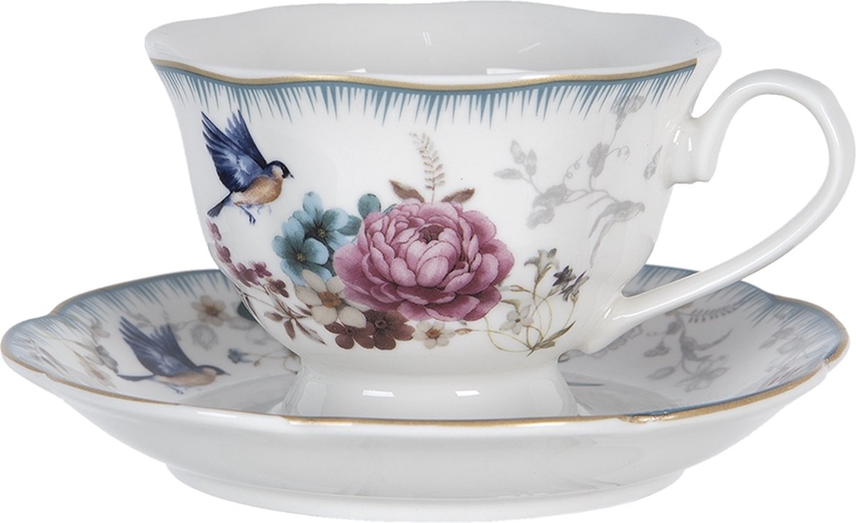 Clayre & Eef Kop en schotel 220 ml Wit Roze Porselein Rond Bloemen Servies