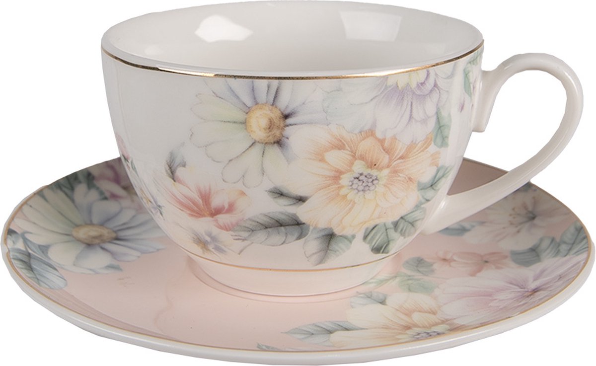 Clayre & Eef Kop en Schotel 250 ml Roze Wit Porselein Bloemen