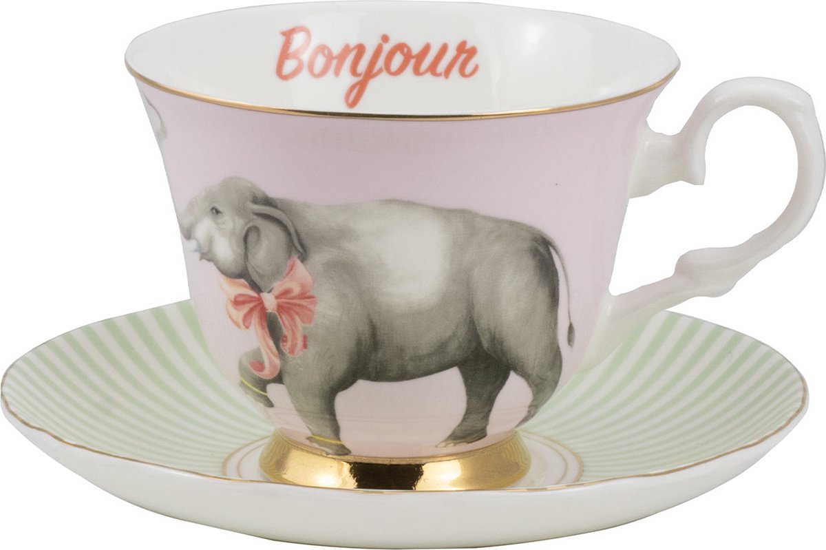 Deze prachtige kop en schotel van Yvonne Ellen London is een echte blikvanger. Het unieke ontwerp met een roze olifant op het kopje maakt elke theepauze bijzonder. Met een inhoud van 280ml is het de perfecte maat voor je favoriete warme drank.
