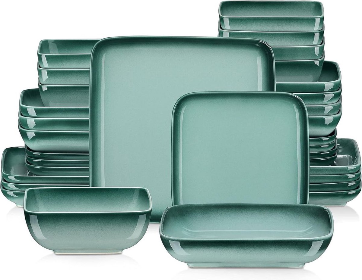 Het vinden van een serviesset die niet alleen praktisch is, maar ook een stijlvolle uitstraling heeft, kan een uitdaging zijn. Je wilt een set die perfect past bij je interieur en die bij elke maaltijd een bijzondere sfeer creëert. De Serviesset 8 Persoons Groen biedt die perfecte balans! Het moderne vierkante ontwerp in een verfijnde donkergroene gradiënt voegt een elegante en rustgevende uitstraling toe aan elke tafel. Deze 32-delige dinerset is precisie vervaardigd met reactief glazuur, waardoor elke schaal een zachte, natuurlijke tint krijgt die je maaltijd naar een hoger niveau tilt. Dankzij de uitstekende afwerking en het duurzame materiaal is deze set niet alleen een visueel meesterwerk, maar ook een praktisch en langdurig stukje keukengerei.