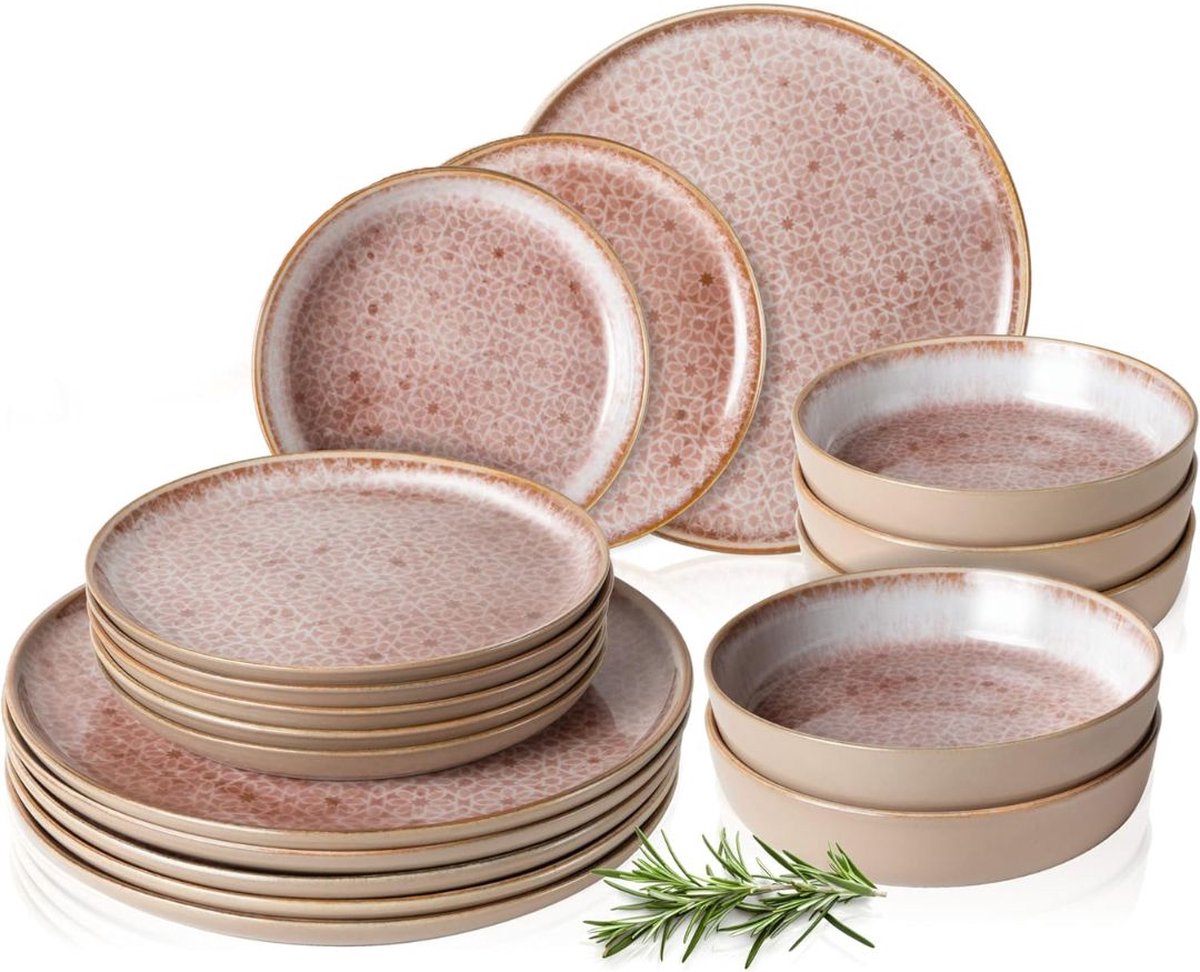 Het prachtige roze servies is vervaardigd uit hoogwaardig porselein, wat niet alleen zorgt voor een luxe uitstraling, maar ook voor de nodige duurzaamheid. Het set bestaat uit 6 dinerborden, 6 dessertborden en 6 kommen, ideaal voor een maaltijd met 6 personen. Dankzij de elegante uitstraling en de roze tint brengt dit servies een frisse, mediterrane flair naar je eettafel. Zo maak je van elke maaltijd een speciale gelegenheid, of het nu een gezellige doordeweekse avond is of een luxe diner voor gasten.