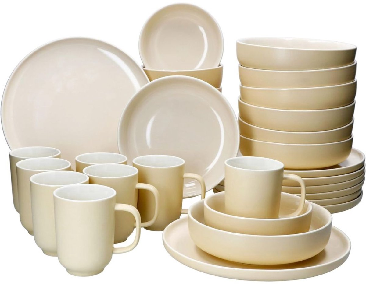 Ben je het ook zo beu om een mismatch van borden op tafel te zetten bij een diner met vrienden of familie? Niets haalt de sfeer zo snel onderuit als een onvolledig servies. Met de Serviesset 8 Persoons – Geel hoef je je daar nooit meer zorgen over te maken. Deze complete, stijlvolle set biedt niet alleen alles wat je nodig hebt voor ontbijt, lunch, diner én koffiemomenten, maar straalt ook pure elegantie uit dankzij het unieke ontwerp met twee soorten glazuur – een subtiel glanzend vanillekleurig bovenwerk gecombineerd met een mat donkerder accent. Het zachte, moderne design en het aangename soft-touch-gevoel zorgen voor een luxe ervaring bij elke maaltijd.