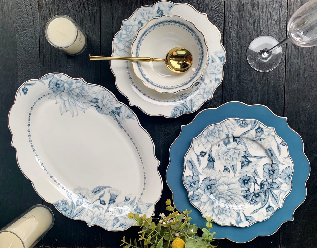 Geschikt voor 6 personen. Een complete serviesset inclusief dinerborden, diepe borden, soepkommen, gebaksborden en een saladeschaal. Alle borden en schalen zijn gemaakt van hoogwaardig beenderporselein, beter bekend als New Fine Bone Porselein. Dit is een luxe porseleinsoort van hoge kwaliteit, gemaakt volgens een speciaal procedé.